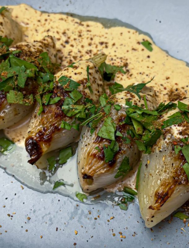 - Meanwhile, blanch the outer petals of the onion in salted water, then chill them in lightly salted ice water and dab dry.